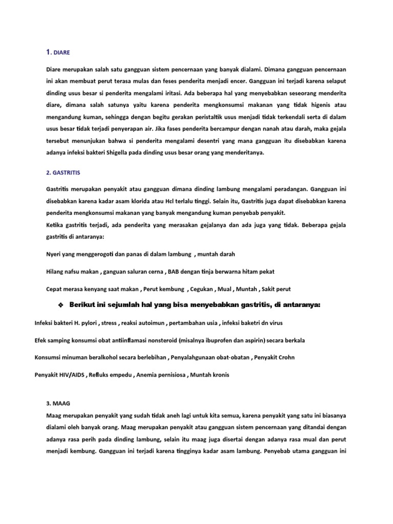 Oleh karena itu diagnosis untuk menentukan penyebab terjadinya nyeri perut sangat penting untuk dilakukan. Gastritis merupakan penyakit mekanisme perlindungan dalam lambung mulai yang cenderung mengalami kekambuhan berkurang sehingga menimbulkan peradangan sehingga menyebabkan pasien harus berulang kali (inflamasi). Diare dapat terjadi karena adanya iritasi pada selaput dinding Gastritis, ulkus peptikum dan karsinoma gaster adalah beberapa gangguan/penyakit pada lambung. Maybe you would like to learn more about one of these?